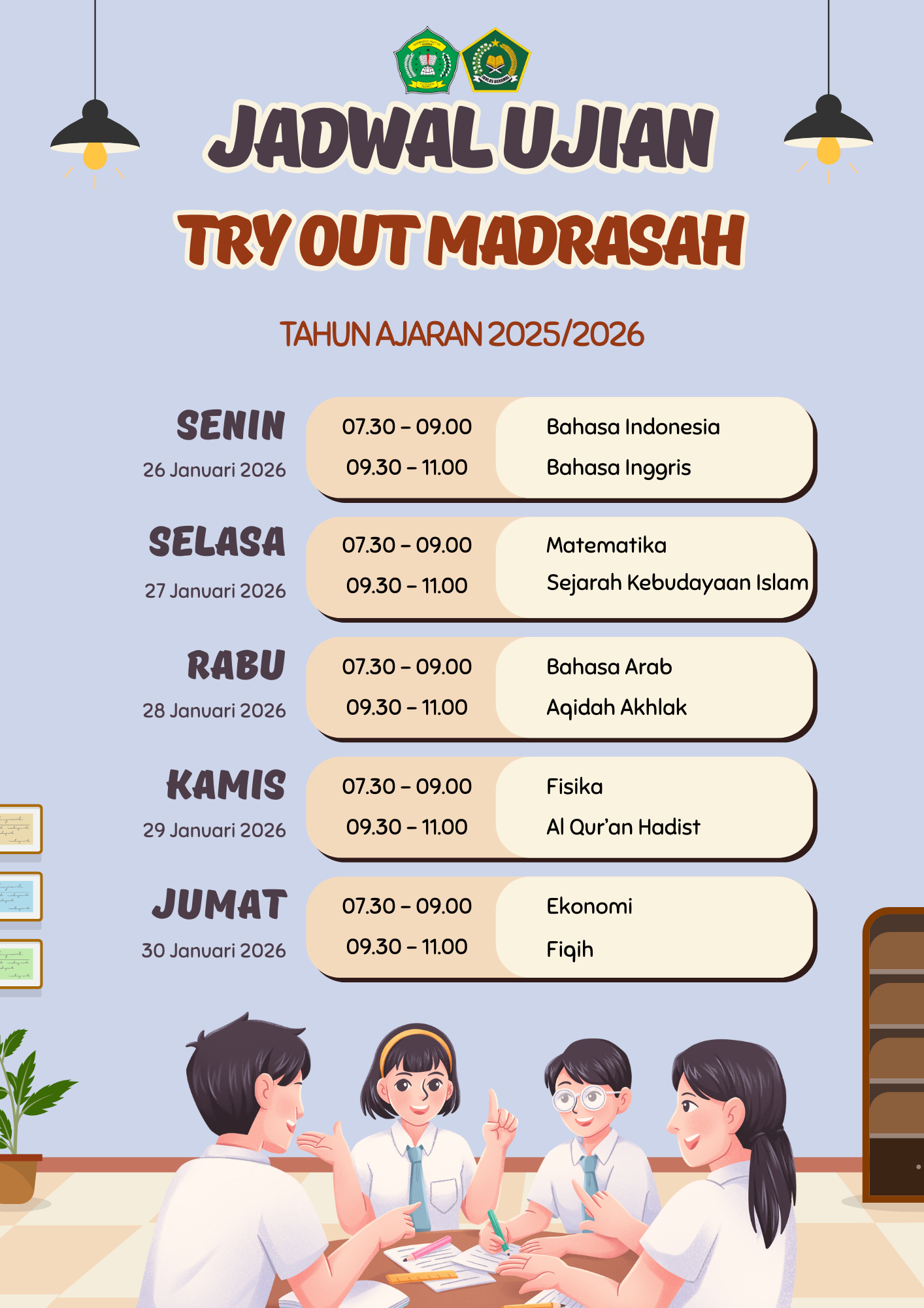 Kehadiran: Peserta wajib hadir di madrasah paling lambat 15 menit sebelum sesi dimulai.