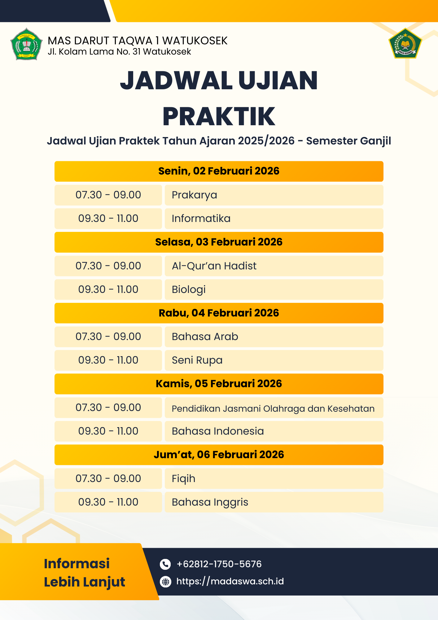 Diberitahukan kepada seluruh siswa-siswi kelas XII MA Darut Taqwa 1 Watukosek, bahwa dalam rangka memenuhi persyaratan kelulusan dan mengukur kompetensi psikomotorik siswa, Madrasah akan menyelenggarakan Ujian Praktik yang akan dilaksanakan pada: